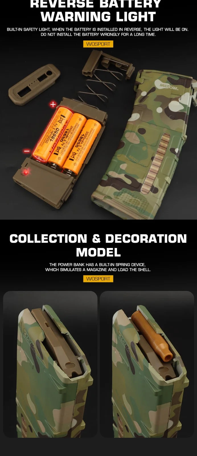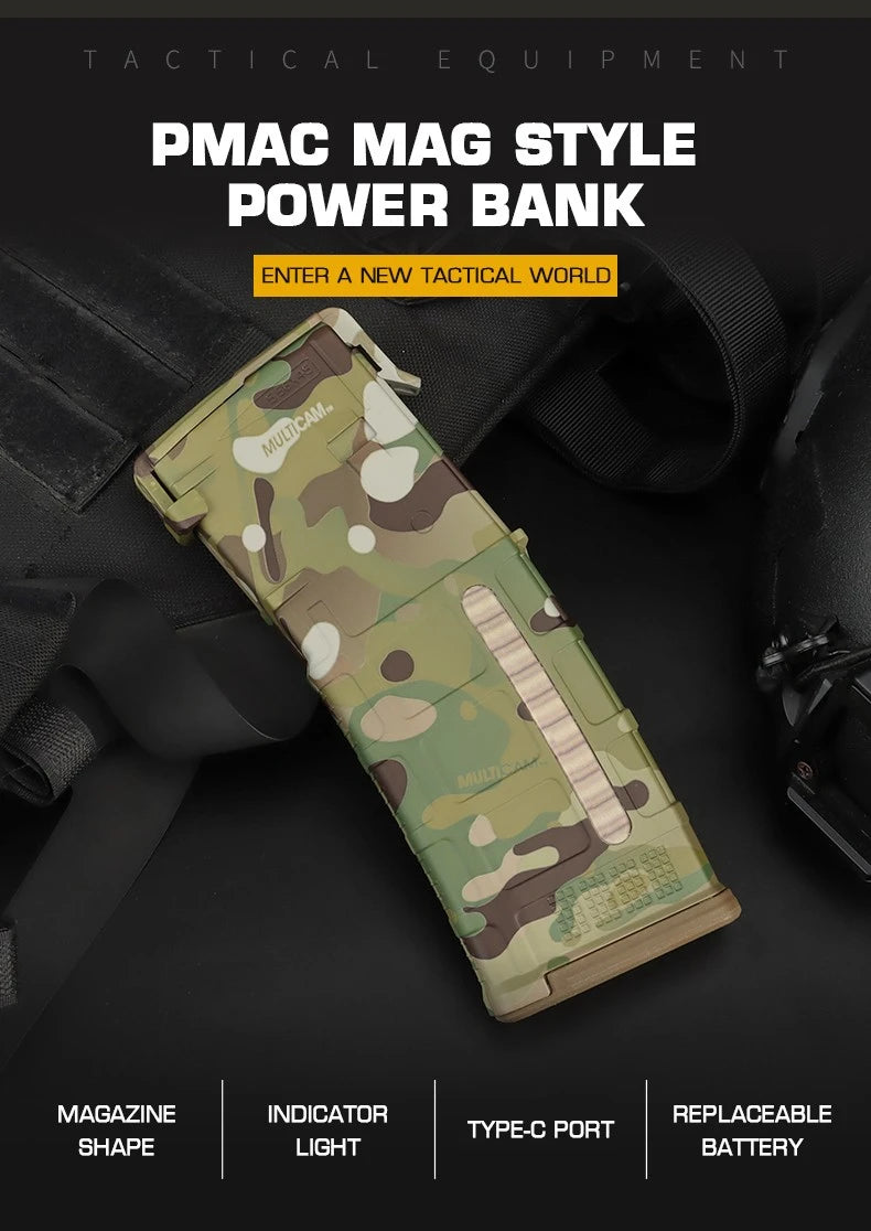 Innovative tactical power bank case featuring magazine-style design with replaceable battery system. Perfect for tactical operations and outdoor activities.