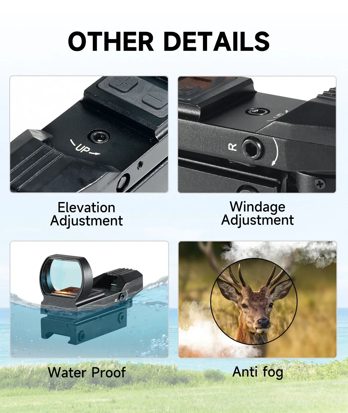 Constructed from aerospace-grade aluminum alloy, the HD101 is waterproof, fog-proof, and shock-resistant, built to withstand demanding airsoft conditions and repeated use. Windage and elevation adjustments (±35 MOA, 1 MOA per click) allow precise zeroing, with adjustment tools included.